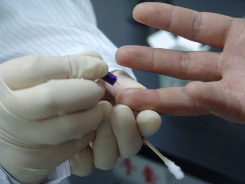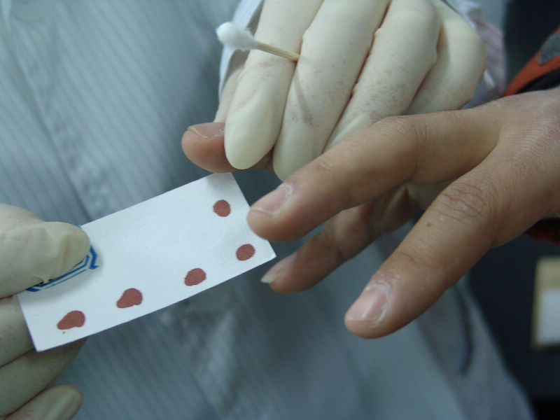 酒精消毒采血部位后用针刺破指尖或耳垂,依次挤五滴黄豆粒大小血滴,散开滴在医用纱布上(要浸透3层);
