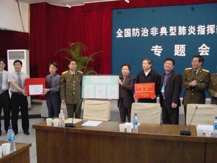 SARS鉴定及诊断试剂研制工作场景向全国防治非典型肺炎指挥部捐赠 30 万人份的“ SARS 病毒酶联免疫试剂盒”